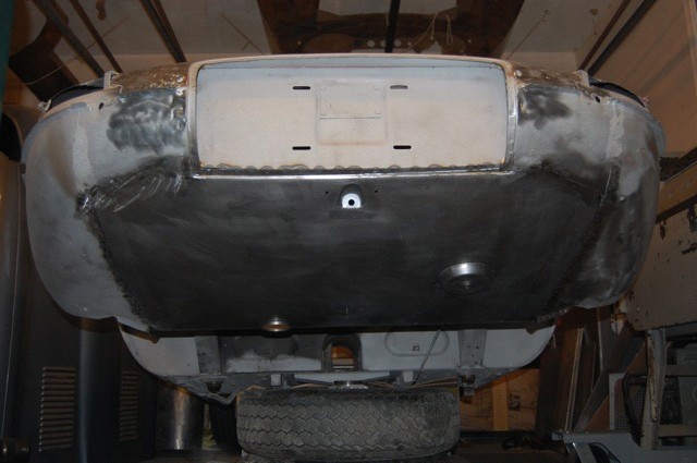 Here’s the side that really matters! It’s easy to foget that when you’re replacing this panel without putting the shell in the rotisserie. A minimal amount of filler will be required on the angled, butt-welded seams that run out from the bottom corners of the license panel, and should then fill about half of the side, flanges seams. The very forward half of the side seams ahould have no filler, and be painted as a raw seam – that is how they came out of Coventry – they only leaded as much of the seam as you could see without laying down on the ground.